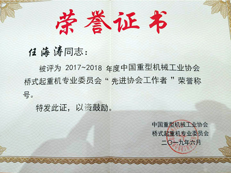 會上,表彰了2018年度全國企業(yè)。河南礦山再次榮獲“門式起重機生產企業(yè)”榮譽稱號,此前,公司已多次獲得該項榮譽;公司總經理任海濤榮獲2017-2018年度中國重型機械工業(yè)協會橋式起重機委員會“先進協會工作者”榮譽稱號。